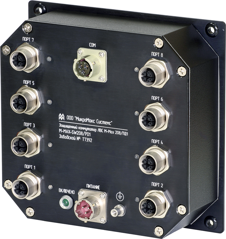 M-Max SW208/PD1 — защищенный 8-портовый администрируемый коммутатор уровня Layer 2+ сети Gigabit Ethernet, обеспечивающий надежную работу в сложных условиях, включая транспорт, сельское хозяйство, приложения добычи и переработки сырья.