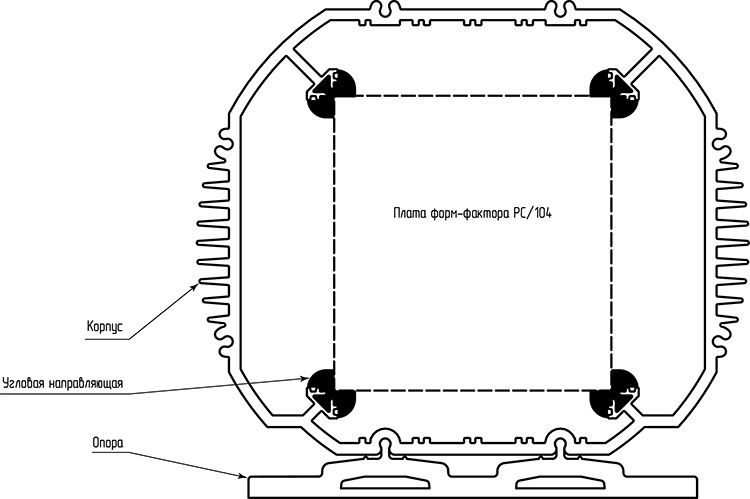 Корпус имеет двойную систему защиты от ударов и вибрации: модули PC/104 располагаются поперечно вдоль всего корпуса на четырех внутренних резиновых направляющих для поглощения высокочастотных вибраций, а все конструкция располагается на толстой резиновой платформе для поглощения низкочастотных ударов и вибраций. Резиновая платформа может быть убрана с целью использования альтернативных вариантов монтажа.