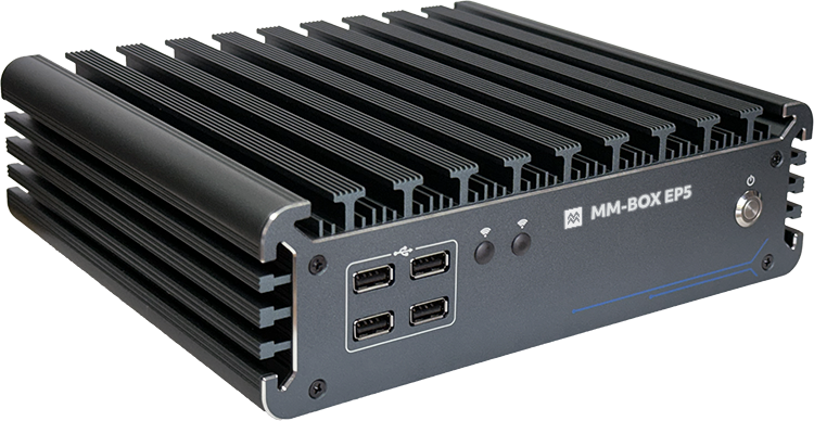MM-BOX EP5 — это компактный промышленный компьютер, оснащенный 4 выходами HDMI. Компьютер построен на базе процессоров Intel Core i3 / i5 / i7 12-го поколения и обладает ОЗУ объемом до 64 ГБ. За обработку видео отвечает графический процессор Intel Iris Xe.
